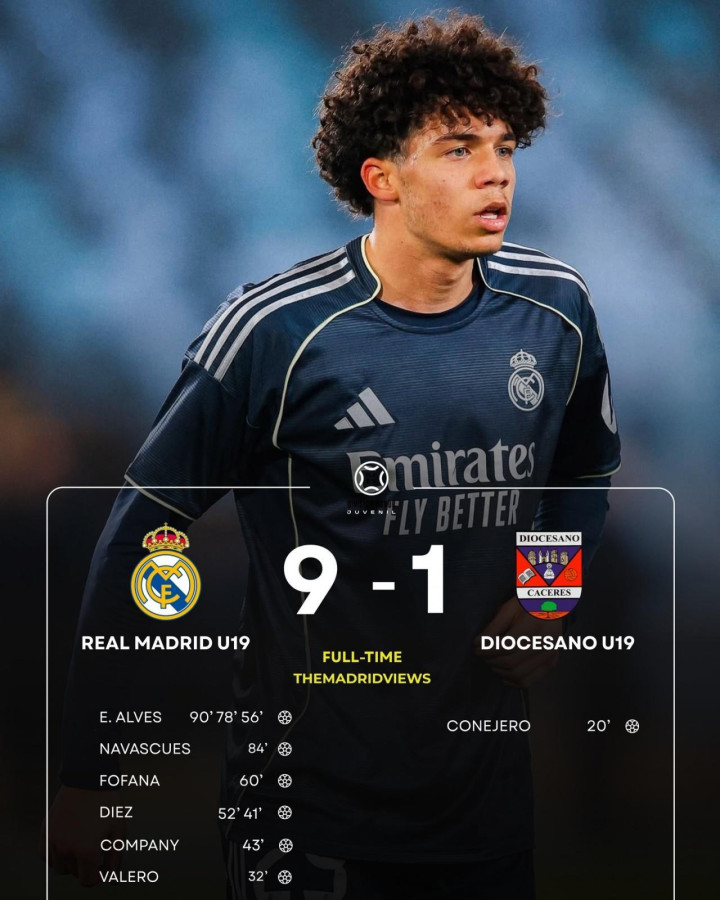 直播吧03月30日讯昨天在一场西班牙U19联赛中,皇马U19队9-1大胜ColegioDiocesano,皇马名宿马塞洛的儿子恩佐·阿尔维斯上演帽子戏法。